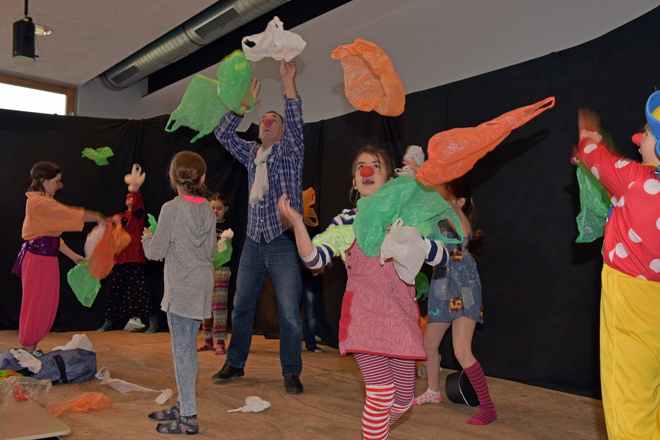 Die Kinder werden spielerisch in die Welt der Clowns eingeführt. Mit speziellen Übungen werden die Basiselemente des Clownsspiels erlernt. Kurze humorvolle Clownnummer können einstudiert und vorgeführt werden.